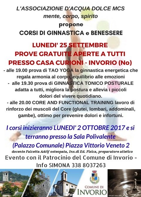 L'Associazione d'acqua dolce MCS, con il patrocinio del Comune di Invorio, propone corsi di ginnastica e benessere.