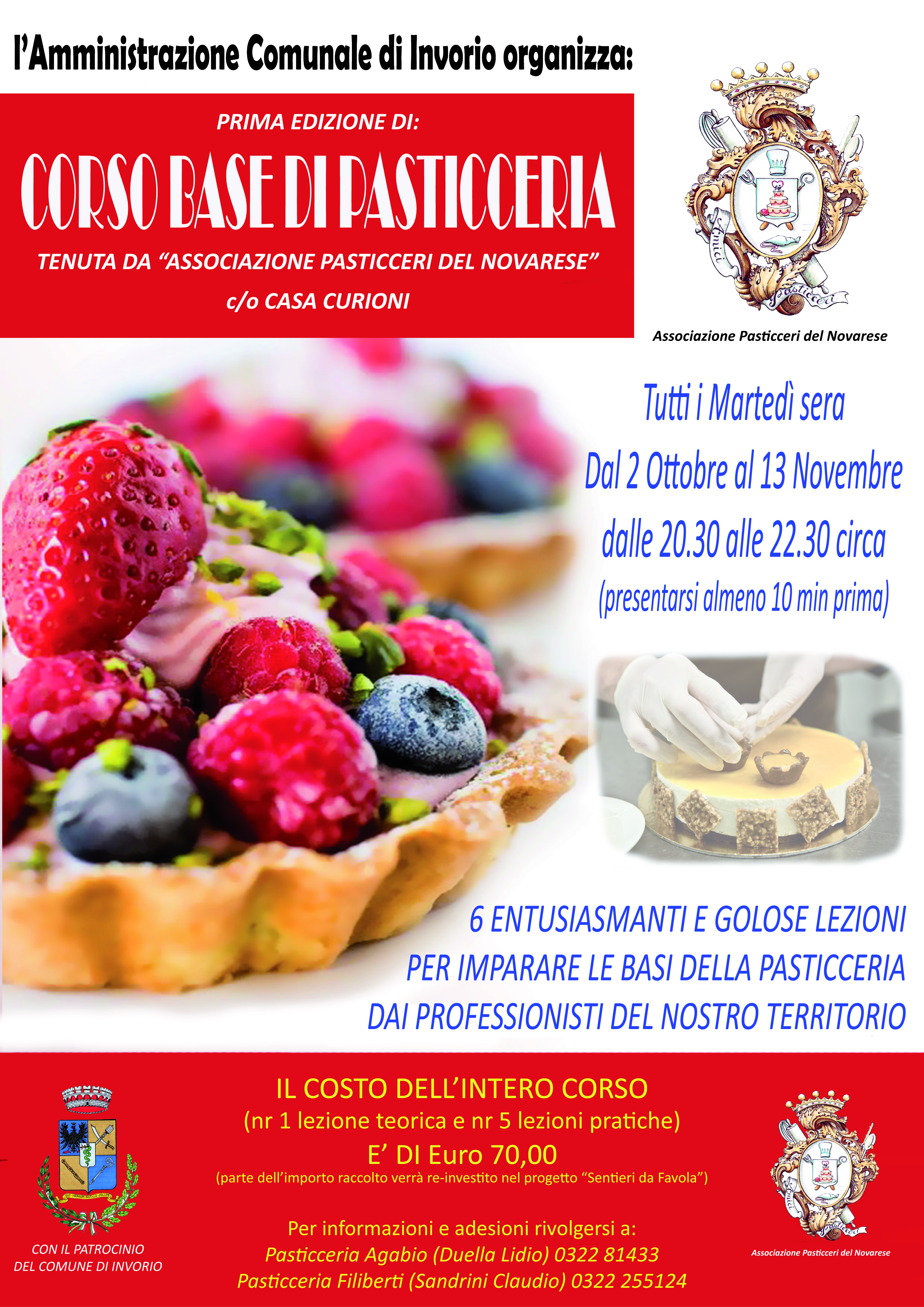Al via le iscrizioni al corso base di pasticceria, patrocinato dal Comune di Invorio e promosso dall'Assessore all'Istruzione Michela Baratelli, organizzato dall'Associazione Pasticceri del Novarese, che si terrà in Casa Curioni, dal 2 ottobre al 13 novembre.