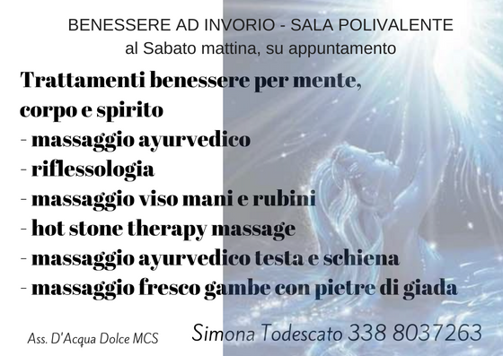 Ad Invorio, su appuntamento, in Sala Polivalente il sabato mattina, l'Associazione D'Acqua Dolce MCS effettuerà trattamenti benessere.