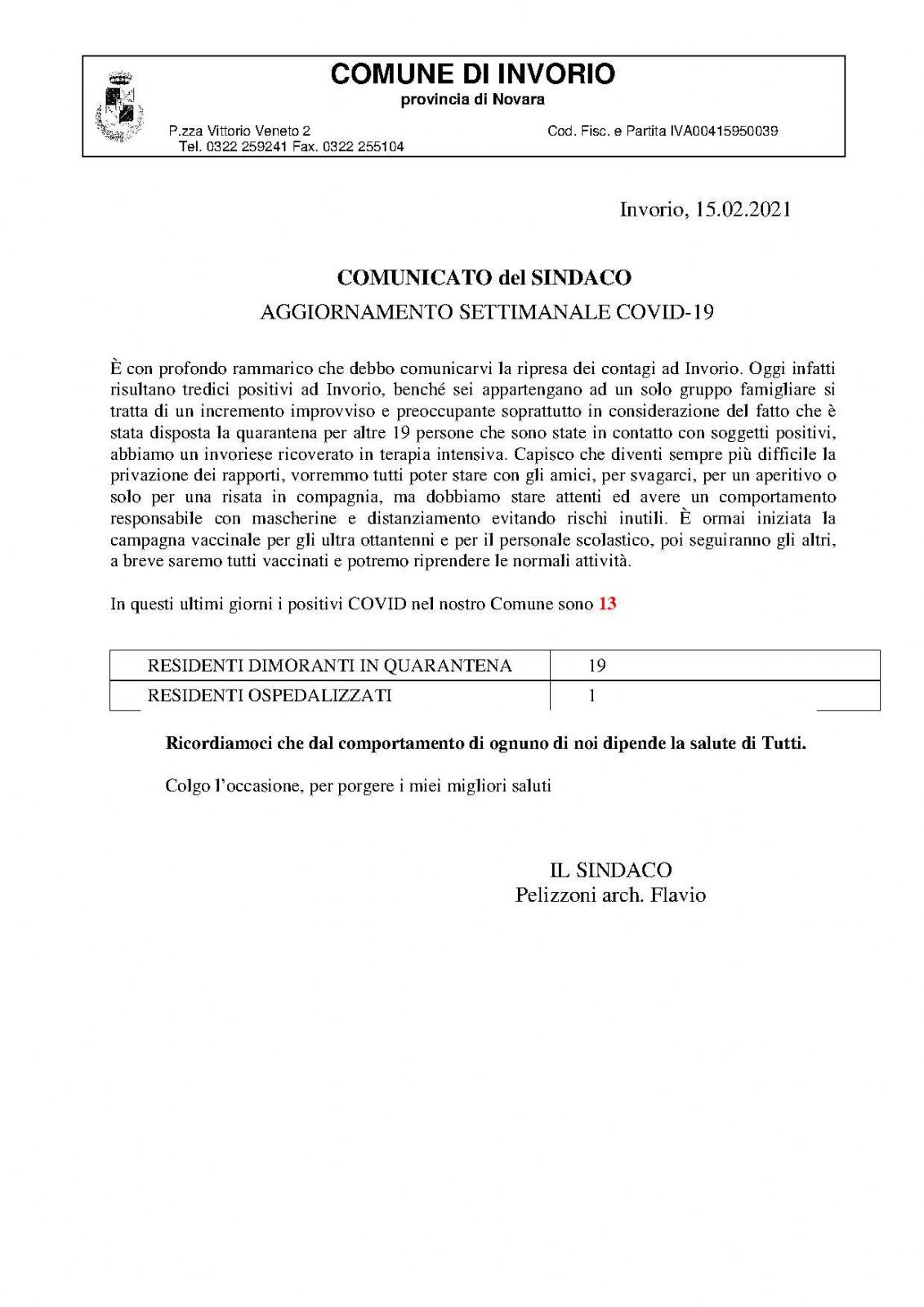 Aggiornamento Emergenza Covid-19 del 15 Febbraio