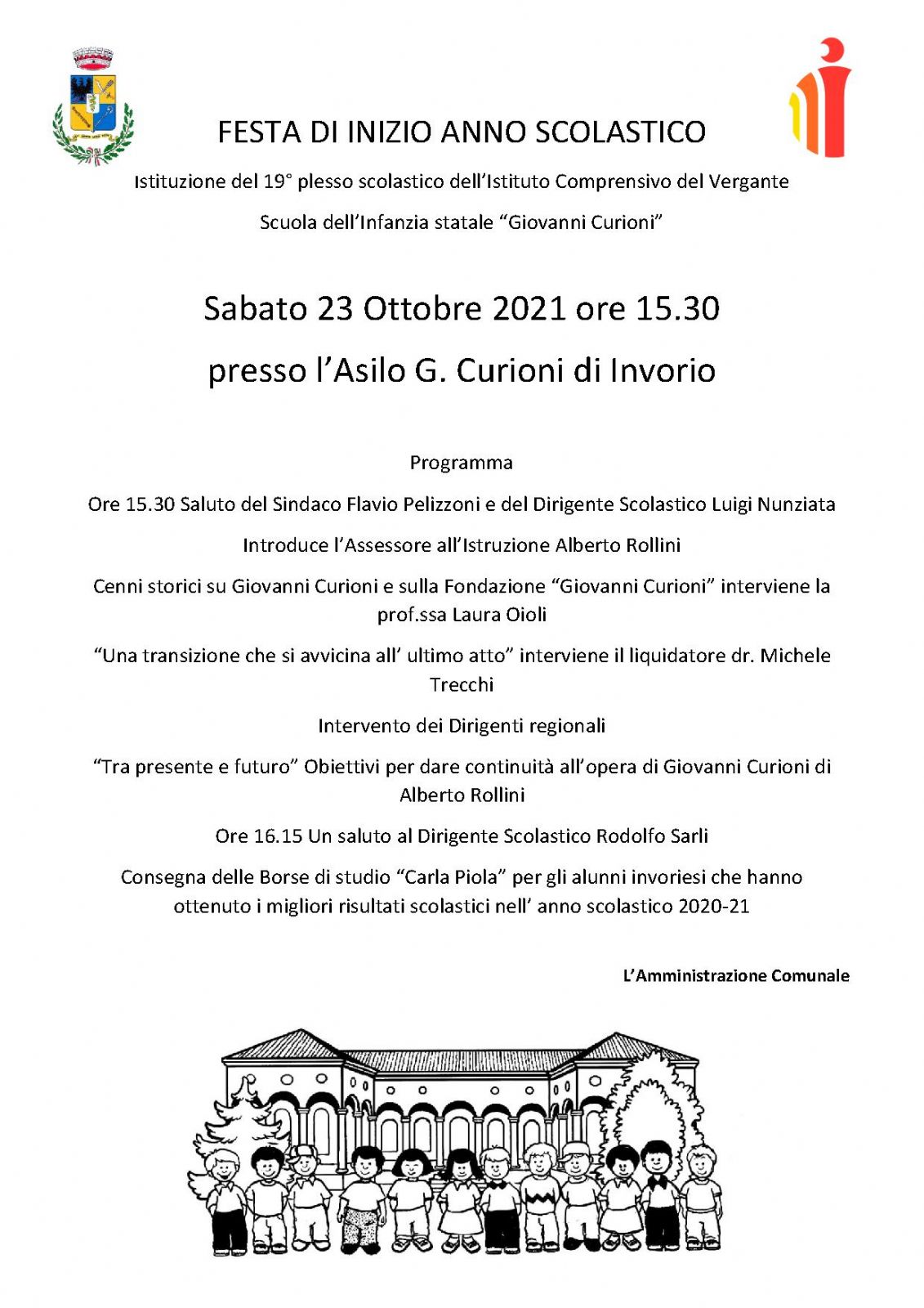 Sabato 23 Ottobre 2021 ore 15.30 presso l’Asilo G. Curioni di Invorio si svolgerà la Festa di inizio anno scolastico e con l'occasione si celebrerà l'istituzione del 19° plesso scolastico dell’Istituto Comprensivo del Vergante - Scuola dell’Infanzia statale “Giovanni Curioni”.