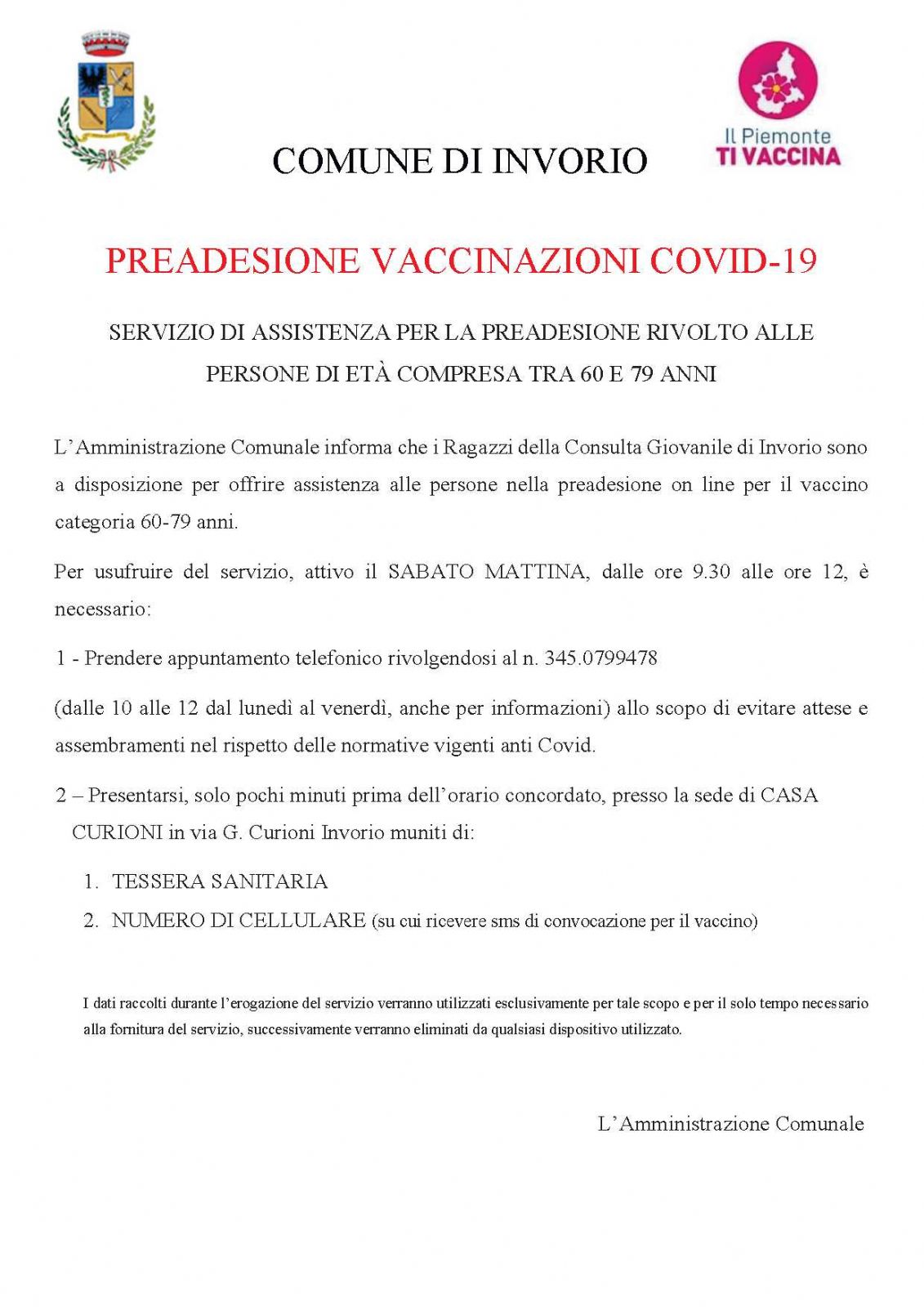 L’Amministrazione Comunale informa che i Ragazzi della Consulta Giovanile di Invorio sono a disposizione per offrire assistenza alle persone nella preadesione on line per il vaccino categoria 60-79 anni.