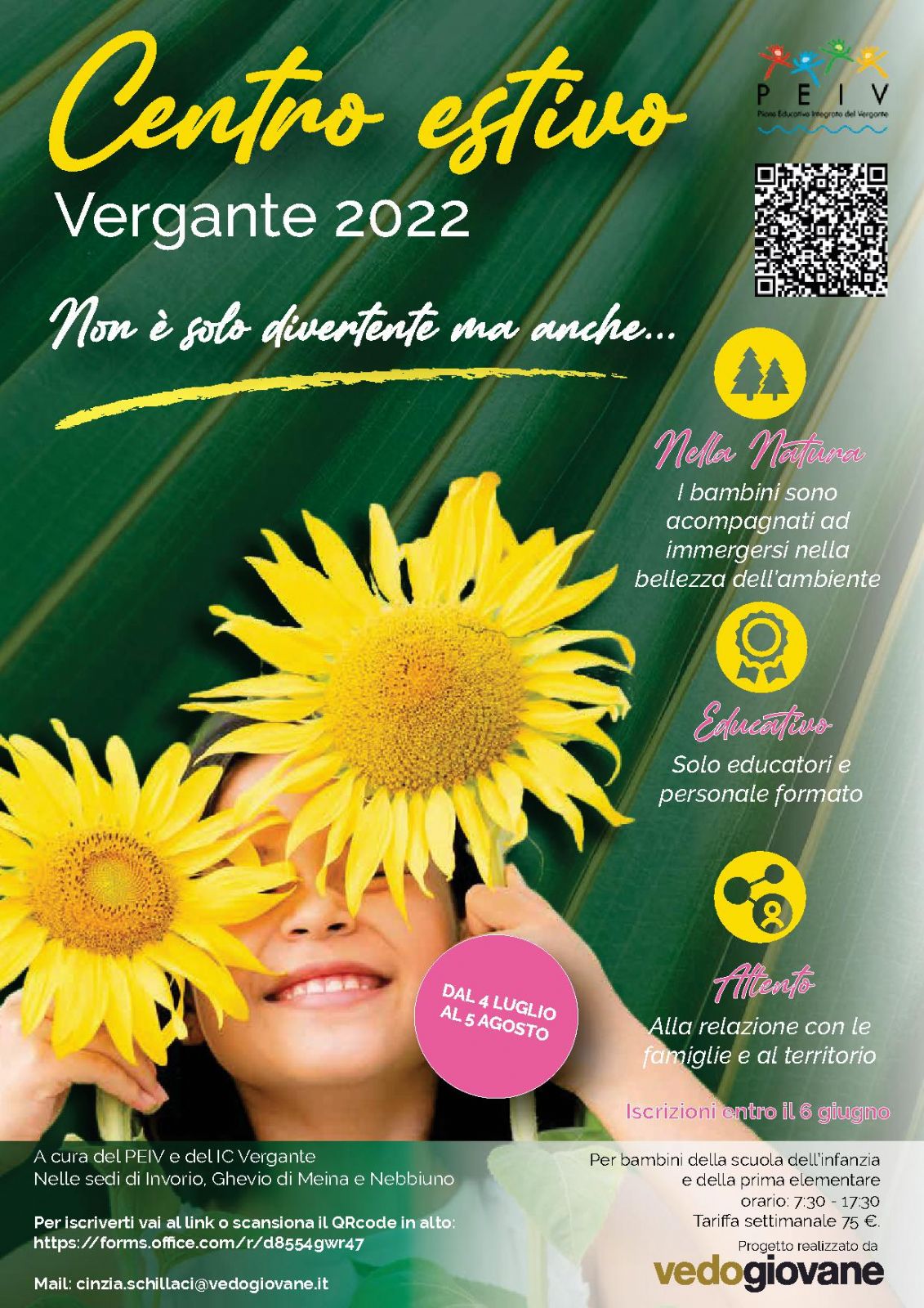Scs Vedogiovane, con il patrocinio del PEIV, organizza un Centro Estivo rivolto ai bambini della scuola dell’infanzia e a coloro che hanno frequentato la 1° elementare (6/7 anni).