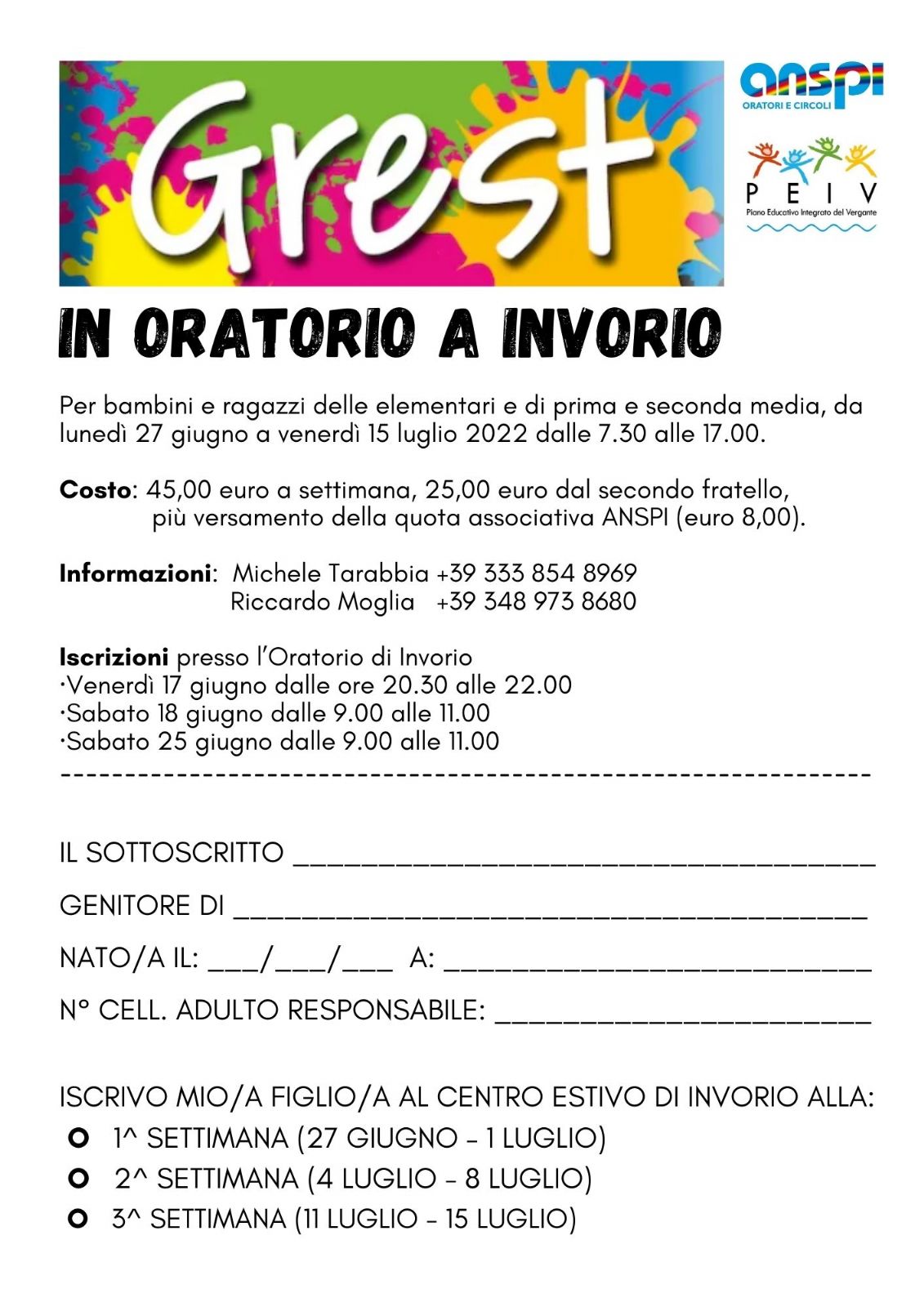 Grest estivo in Oratorio ad Invorio per bambini e ragazzi delle elementari e classe prima e seconda scuola media.