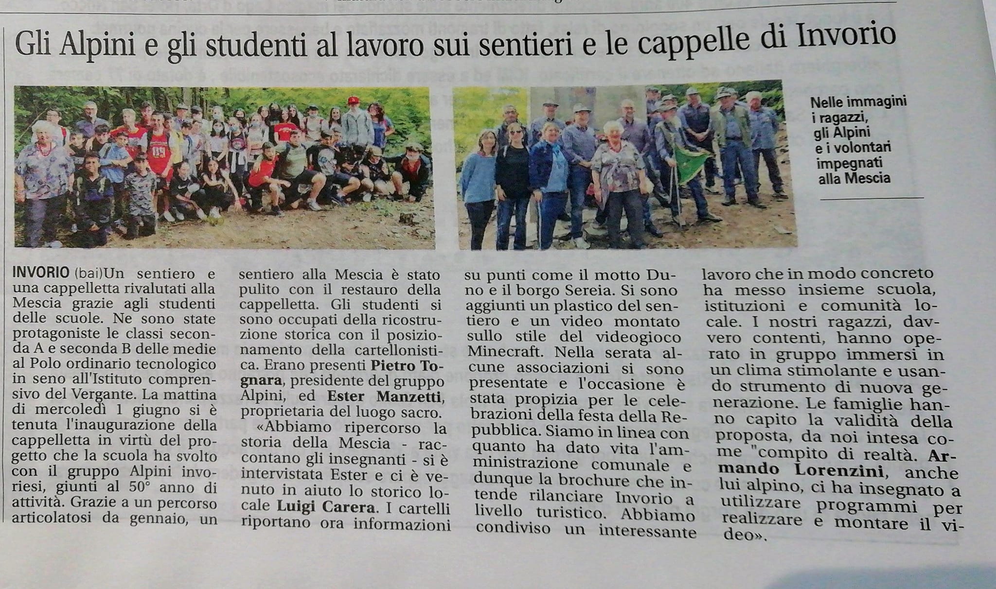- Il Gruppo Alpini di Invorio che, giunto al 50° anno di attività, si è prodigato per il recupero di un sentiero e di una cappelletta nella fraziome Mescia, coinvolgendo anche i ragazzi della scuola secondaria di 1° grado di Invorio.