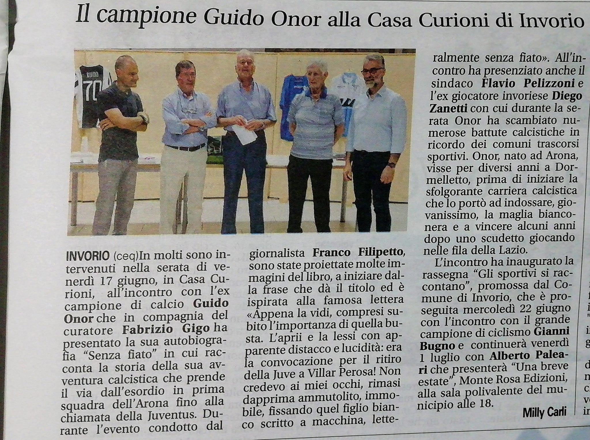 - La rassegna "Gli sportivi si raccontano" promossa dall'Assessorato allo Sport in collaborazione con la Polisportiva Nuovi Orizzonti e il Cai di Borgomanero e che ha visto presenti nel nostro comune Guido Onor, ex calciatore della Juventus e l'invoriese Diego Zanetti. Nella giornata di mercoledì 22 giugno è stato presentato il libro di Gianni Bugno, ex ciclista e vincitore del Giro d'Italia. Gli incontri proseguiranno con Alberto Paleari il 1° luglio alle ore 18 presso la Sala Polivalente del Comune di Invorio.