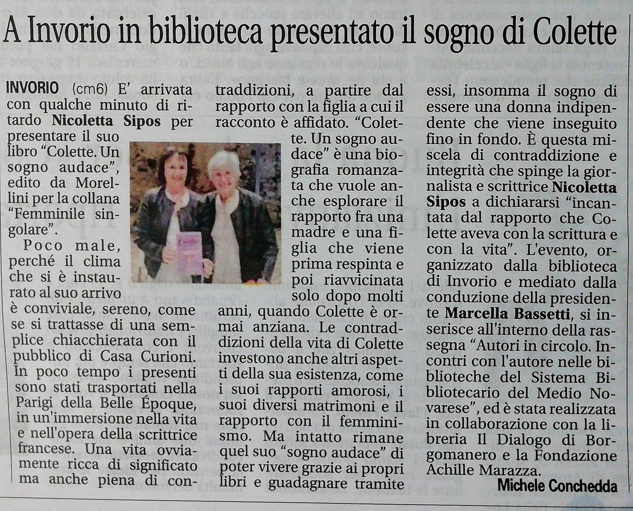 - La biblioteca ha ospitato l'autrice Nicoletta Sipos in Casa Curioni, la quale ha presentato il libro "Colette. Un sogno audace". Il libro ripercorre le vicende dell'artista francese e il suo rapporto con la scrittura.