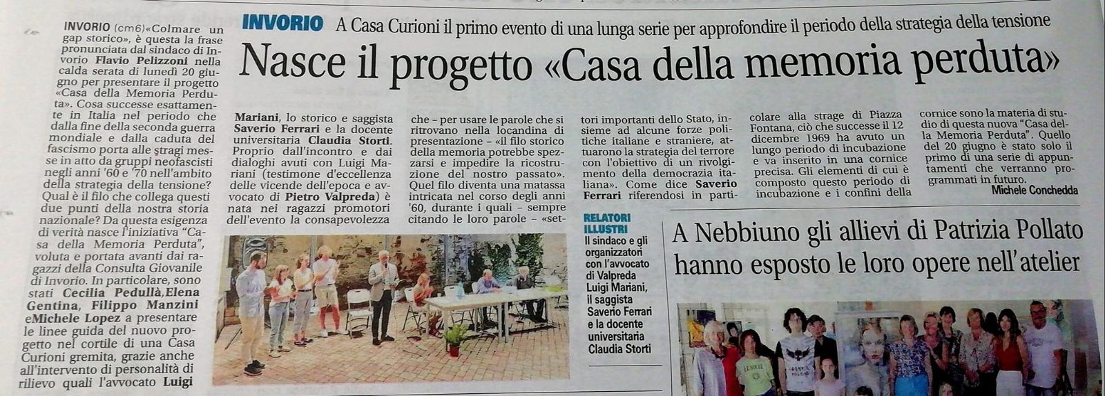 - È nato il progetto "Casa della Memoria Perduta", guidato dall'Avvocato Mariani e da un gruppo di giovani del paese e che ha visto la presenza di ospiti illustri (Claudia Storti e Saverio Ferrari) alla serata di presentazione, oltre a numerose autorità del territorio e sindaci dei comuni limitrofi. Il focus della serata è stato il periodo degli anni '60-'70.