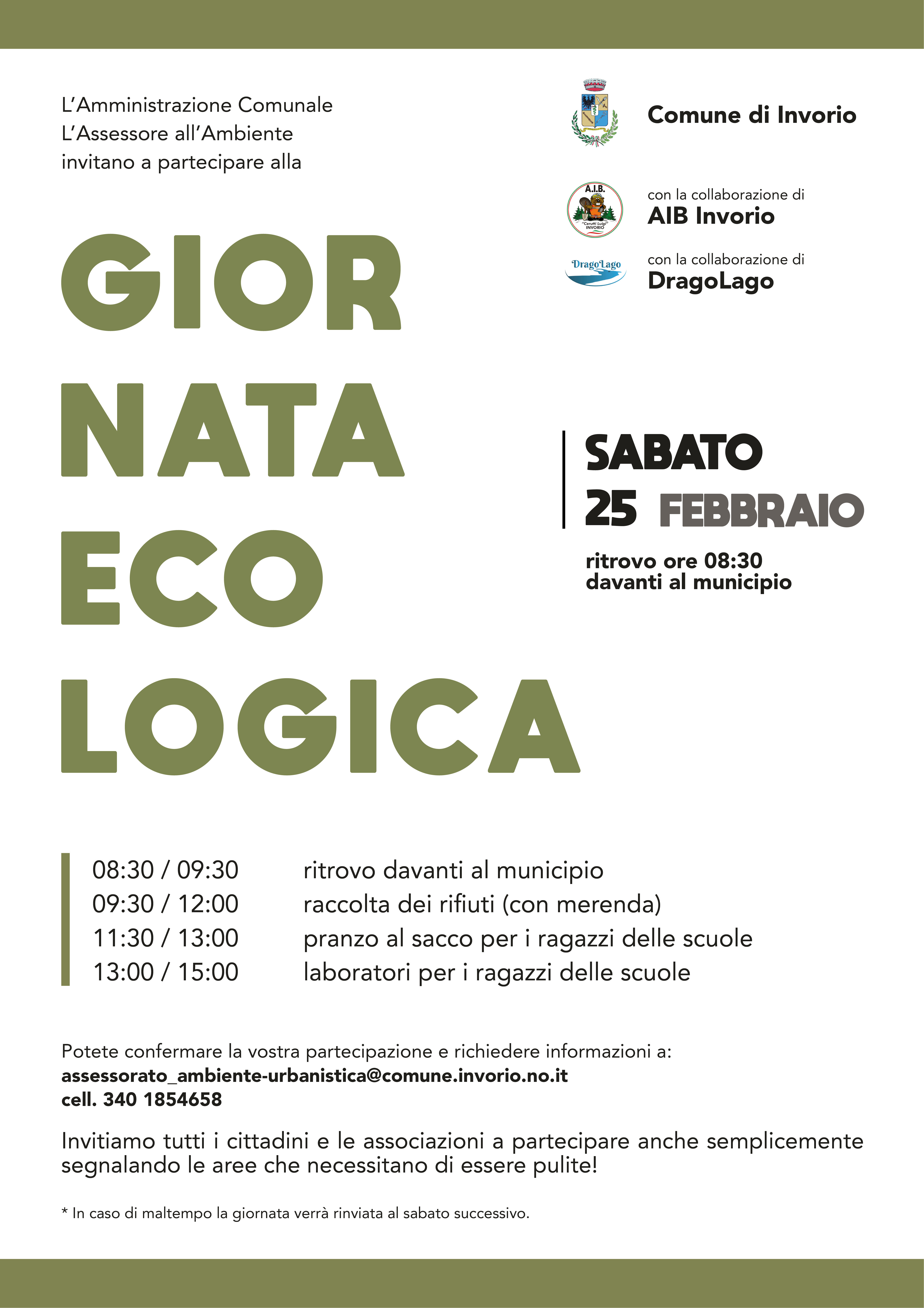 La GIORNATA ECOLOGICA si terrà SABATO 25 Febbraio*, per prenderci cura insieme del NOSTRO TERRITORIO.