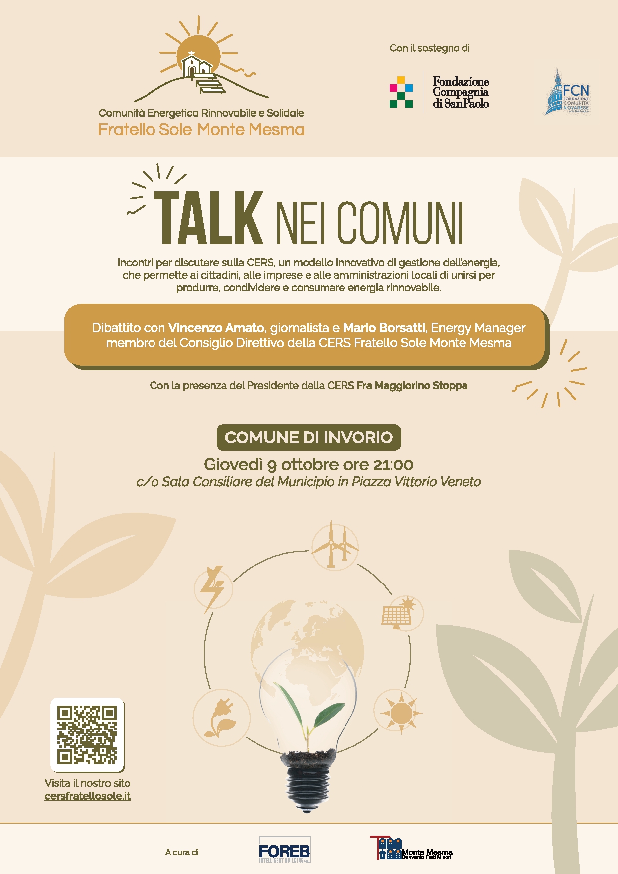 Giovedì 9 Ottobre alle ore 21,00 presso la sala Consiliare del Comune di Invorio si svolgerà un incontro per discutere sulla CERS, un modello innovativo di gestione dell'energia che permette ai cittadini, alle imprese ed alle amministrazioni locali di di unirsi per produrre, condividere e consumare energia rinnovabile.