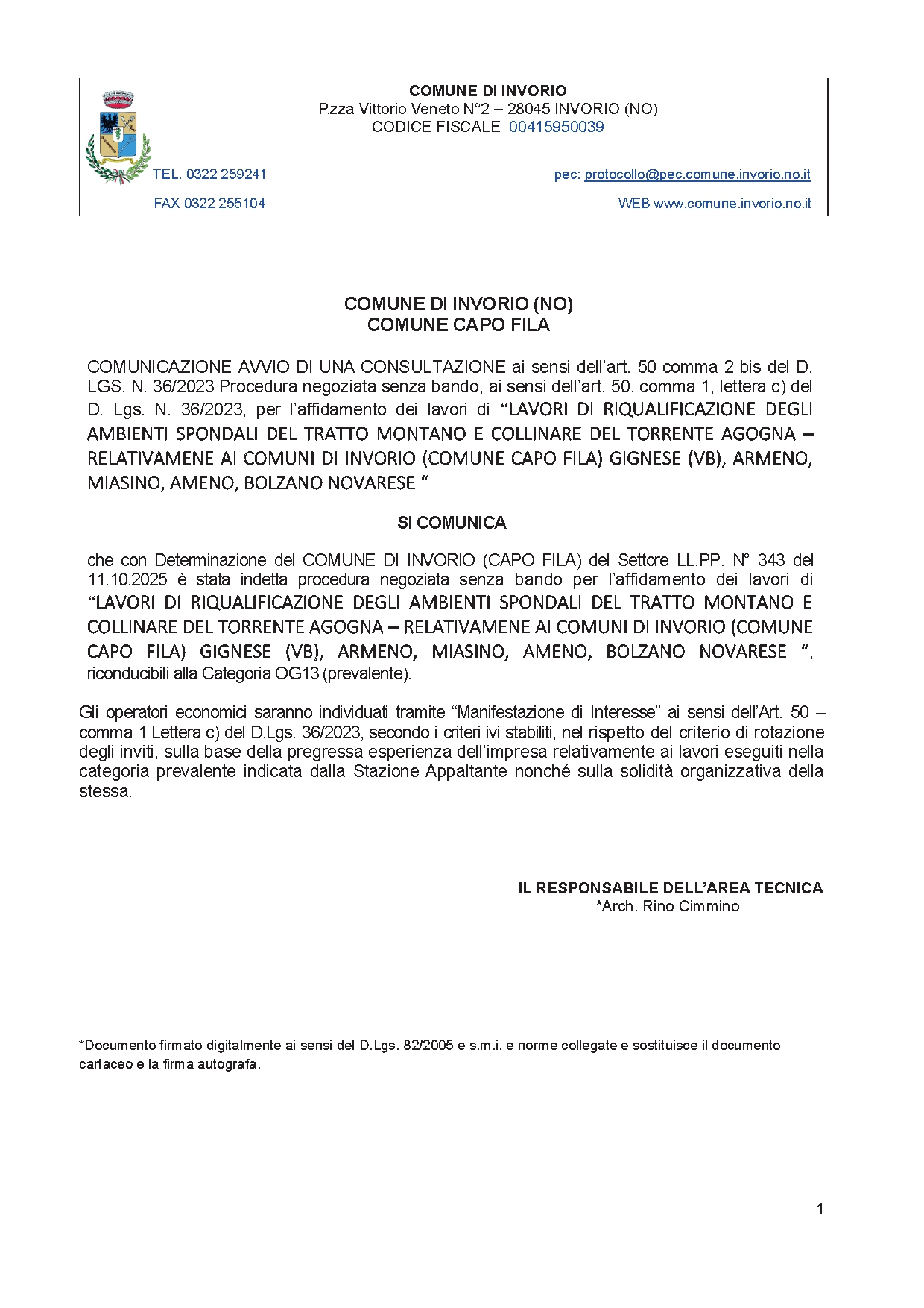 COMUNICAZIONE AVVIO DI UNA CONSULTAZIONE ai sensi dell’art. 50 comma 2 bis del D. LGS. N. 36/2023 Procedura negoziata senza bando, ai sensi dell’art. 50, comma 1, lettera c) del D. Lgs. N. 36/2023, per l’affidamento dei lavori di “LAVORI DI RIQUALIFICAZIONE DEGLI AMBIENTI SPONDALI DEL TRATTO MONTANO E COLLINARE DEL TORRENTE AGOGNA – RELATIVAMENE AI COMUNI DI INVORIO (COMUNE CAPO FILA) GIGNESE (VB), ARMENO, MIASINO, AMENO, BOLZANO NOVARESE “