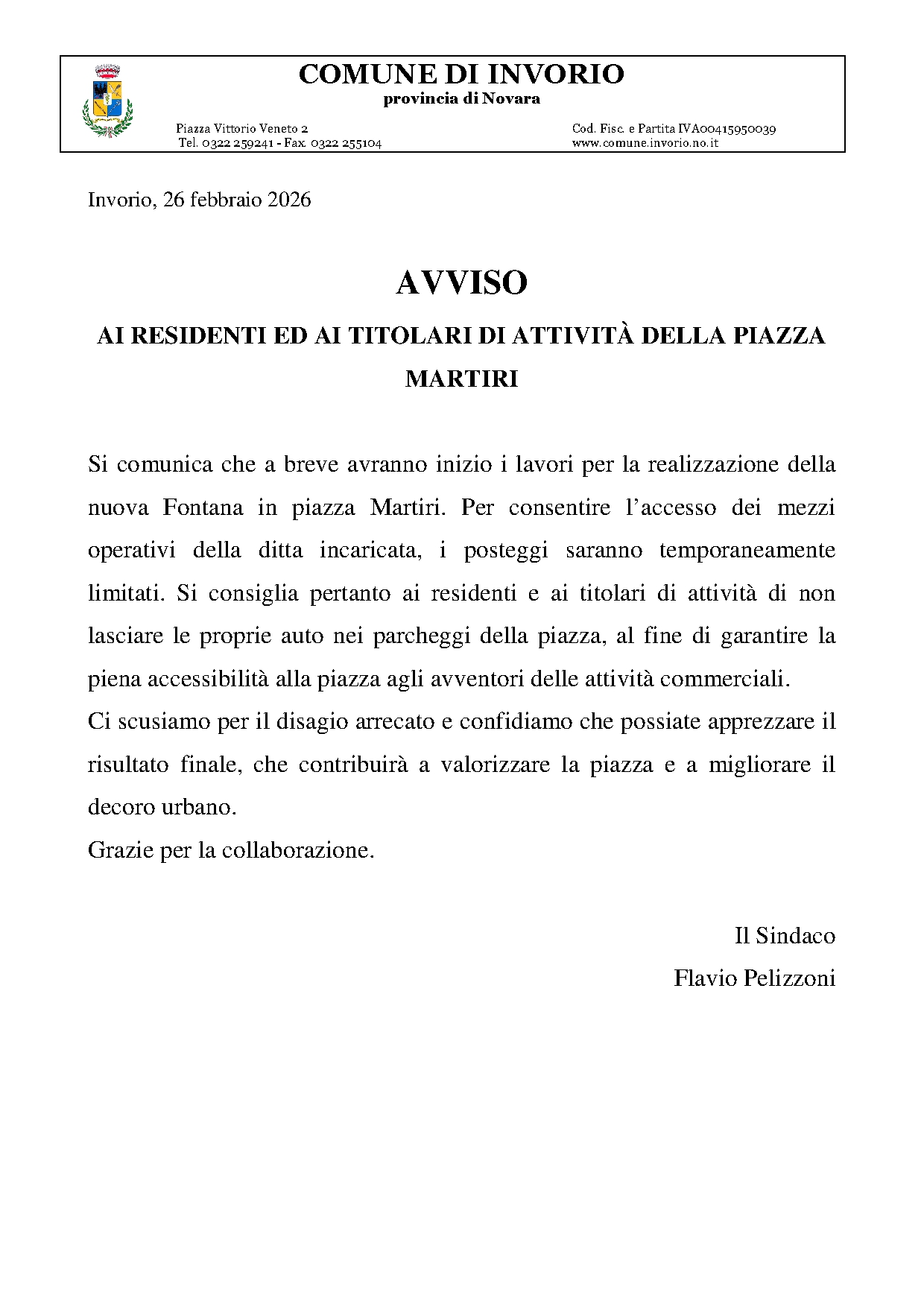Si comunica che a breve avranno inizio i lavori per la realizzazione della nuova Fontana in piazza Martiri. Per consentire l’accesso dei mezzi operativi della ditta incaricata, i posteggi saranno temporaneamente limitati. Si consiglia pertanto ai residenti e ai titolari di attività di non lasciare le proprie auto nei parcheggi della piazza, al fine di garantire la piena accessibilità alla piazza agli avventori delle attività commerciali.