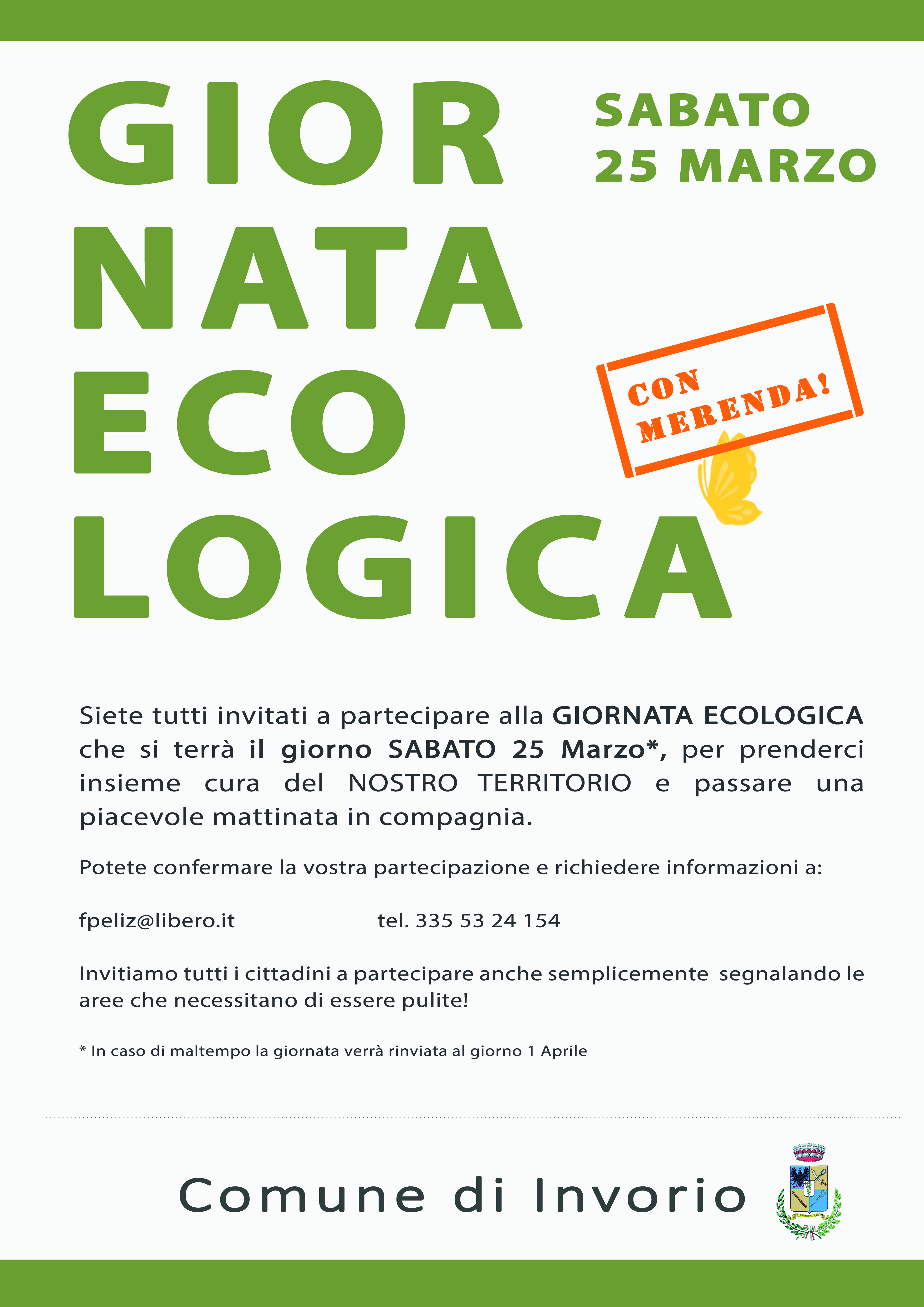 Sabato 25 Marzo siete tutti invitati a partecipare alla GIORNATA ECOLOGICA per prenderci insieme cura del NOSTRO TERRITORIO e passare una piacevole mattinata in compagnia.