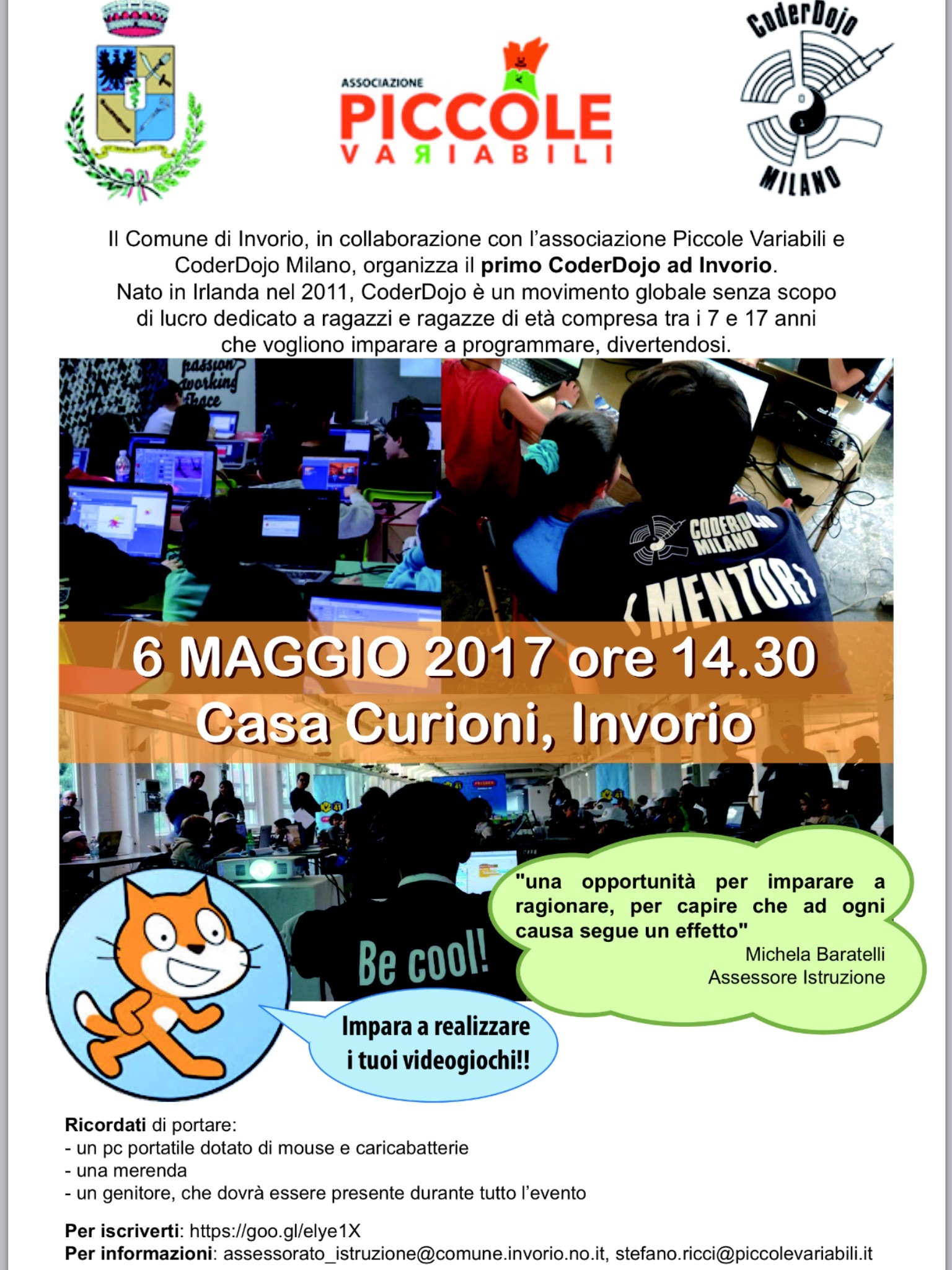 Il Comune di Invorio in collaborazione con le Associazioni Piccole Variabili e CoderDojo Milano organizza presso Casa Curioni alle ore 14,30 un incontro indirizzato ai ragazzi dai 7 ai 17 anni per imparare a programmare. Sul manifesto allegato informazioni sulle modalità di iscrizione.